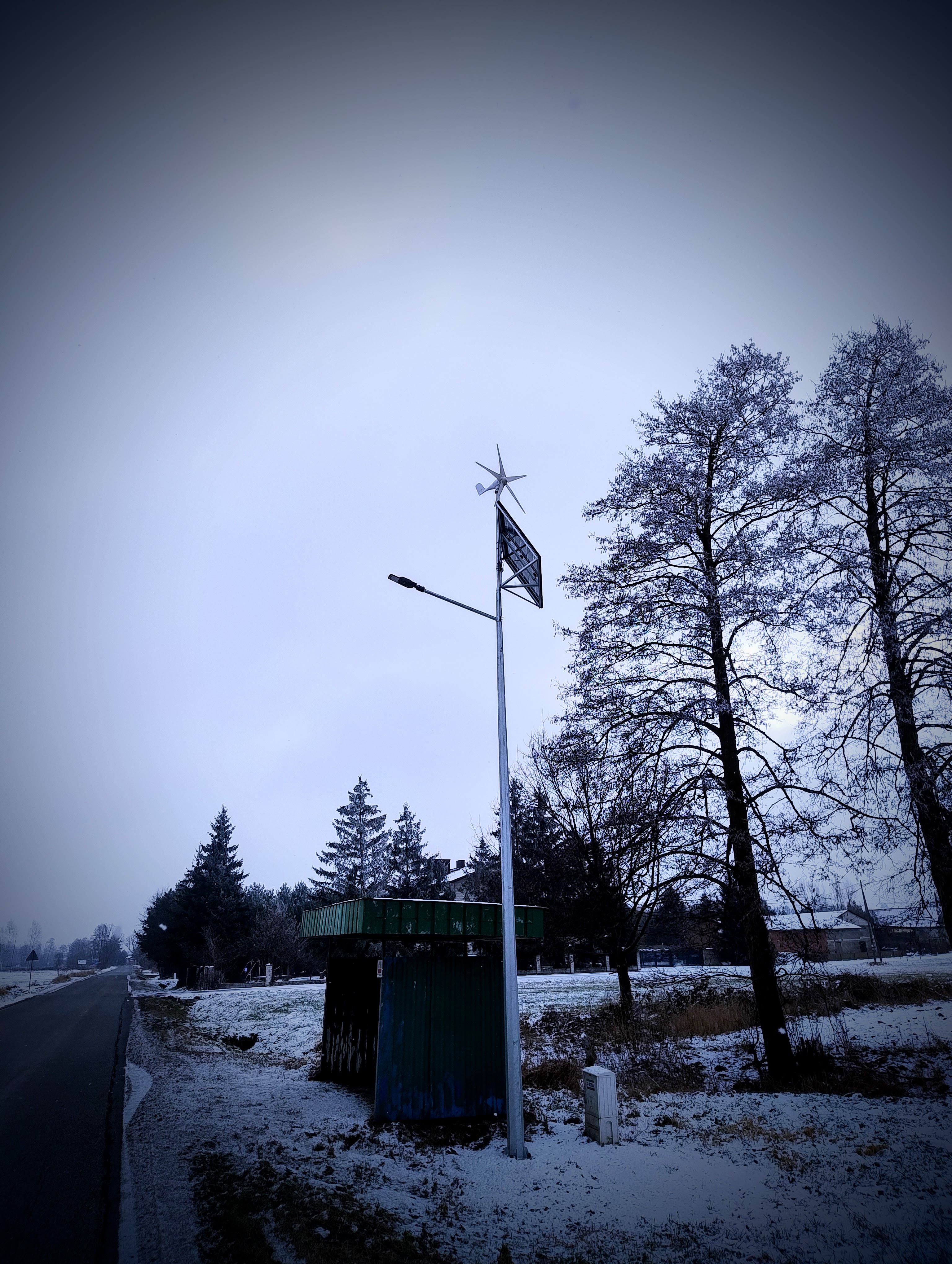 Nowoczesna lampa ulokowana przy przystanku autobusowym przy drodze powiatowej. Zadanie zrealizowane ze środków funduszu sołeckiego z poprzednich lat.